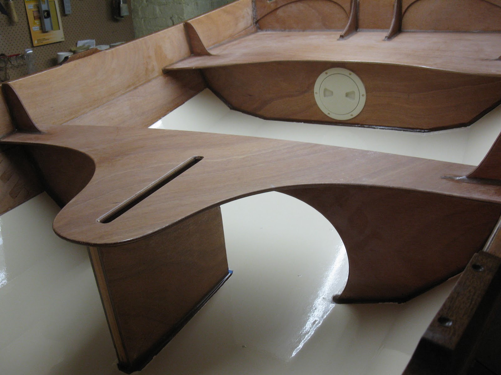 The Finish work takes almost as long as the construction. Knowing this up front helped me to tolerate the process a little better. I put 4 coats of epoxy over everything sanding each coat. As I have the wisdom of hindsight, I would have drilled as many of the needed holes at the start of the finish process. This way I could drill them oversize fill them with epoxy now and drill them to the correct size when installing the hardware later. This "drill fill drill" will prevent moisture from infiltrating the wood and turning black. In a future post I will document the repair work I will need to do to fix the places on my PMD that discolored due to moisture entering the wood. "Drill fill drill" will increase buld time but save repair time. My advice is to do it up front.